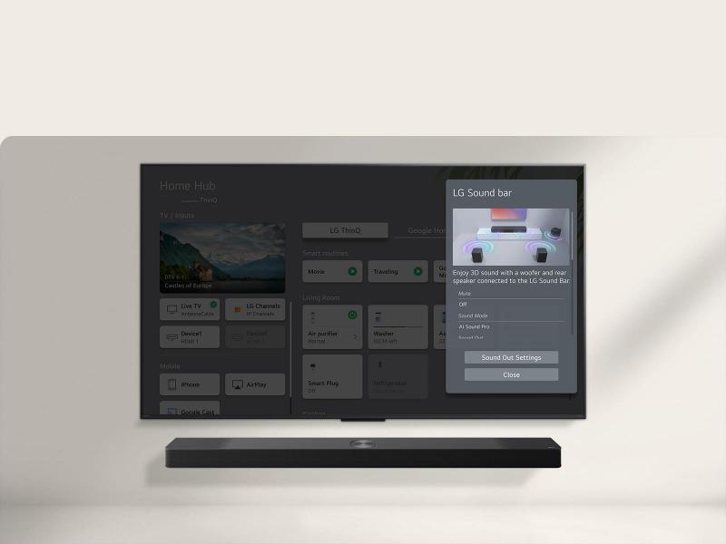 *Soundbar can be purchased separately. *Sound Mode Control may vary by model. *Please note that the service may not be available at the time of purchase. A network connection is required for updates. *The soundbar models compatible with the TV may vary by region and country. *LG TV remote usage is limited to certain features only.