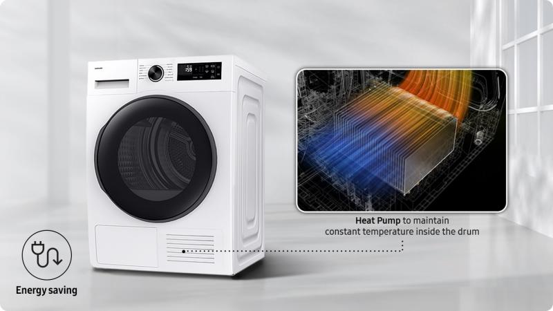Start smarter energy saving by using less electricity* with Heat pump technology. It offers an energy-efficient and gentle way to dry clothes. The dryer uses ‘refrigerant’ instead of electricity to heat the air and recycles warm air to reduce energy waste.