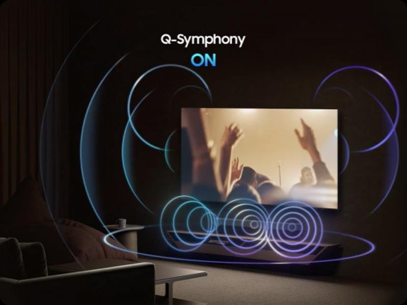 Surround yourself with beautifully orchestrated sound. Samsung technology syncs the TV and soundbar audio to play simultaneously — without muting the speakers of either device.11